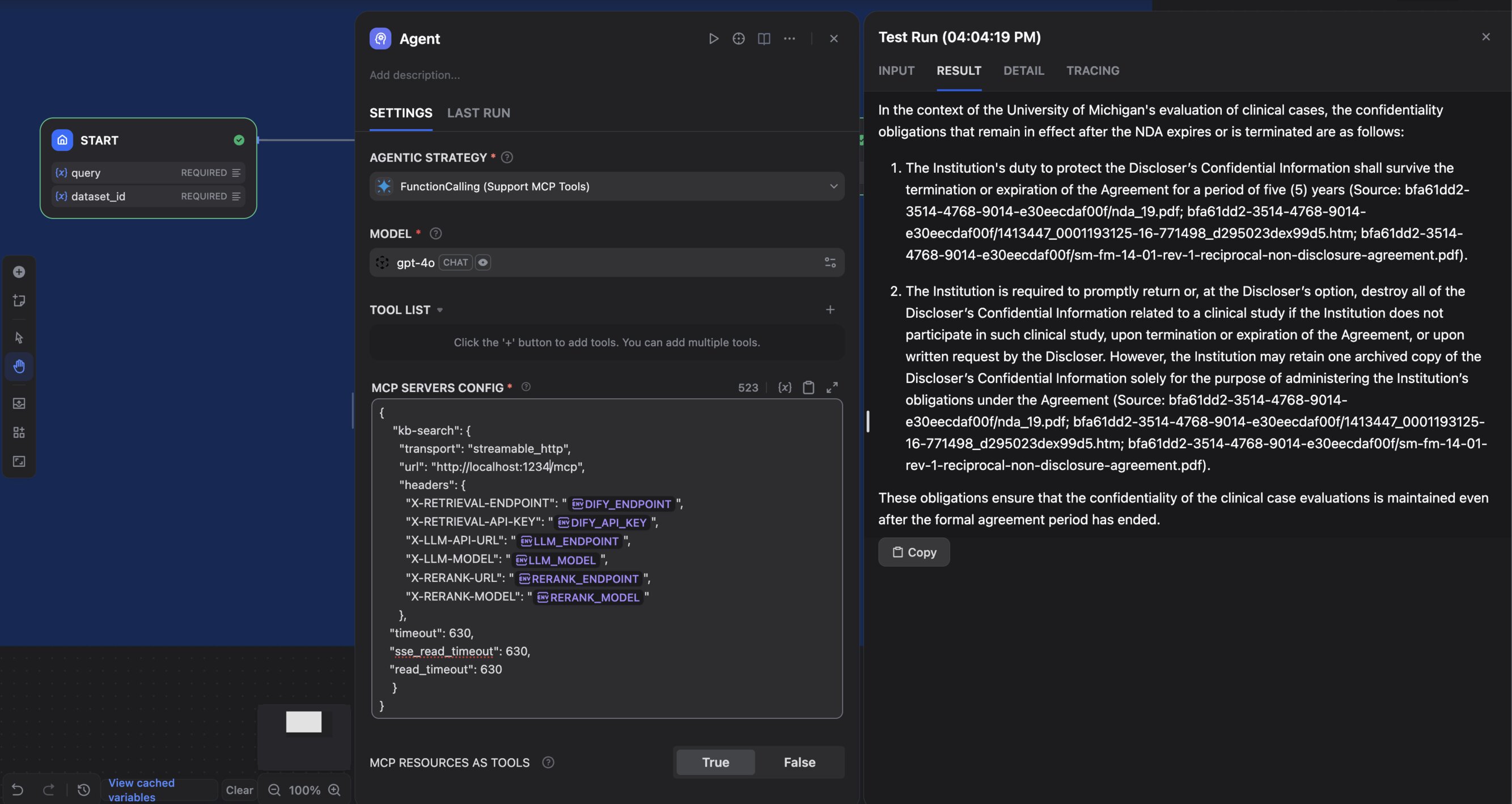 Instead of calling the tools directly, you can configure a Dify workflow to invoke the assistant as a retrieval step. The agent passes the user query and dataset IDs to the MCP server and receives a structured answer with citations. Below is a screenshot of a test run on ContractNLI: