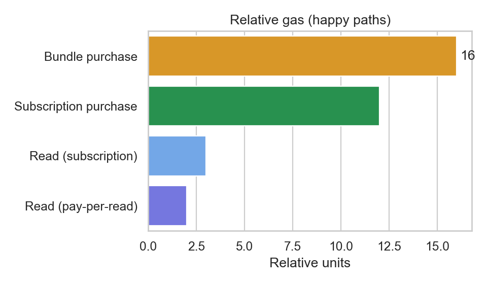 We treat this as a directional signal (not an exact benchmark), but it matches the intuition: bundle/subscription spend more gas upfront because they write more state (expiry tracking, splits), while pay-per-read keeps reads minimal.